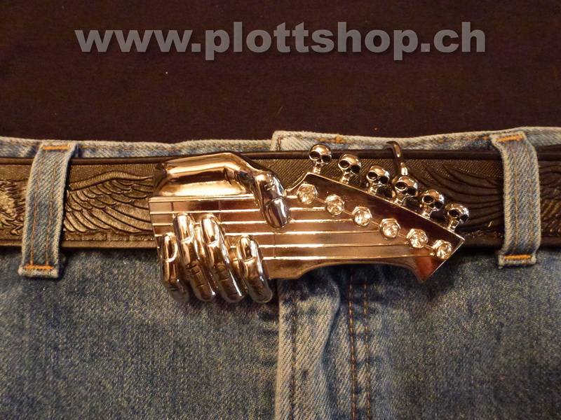 Buckle Gitarrenhals chrom Skulls Totenkopf Hand spielt Gitarre, Musiker, Steinchen, cool!